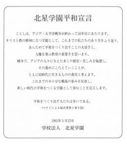 TOP NEWS 日本原水爆被害者団体協議会のノーベル平和賞受賞に寄せて – コピー 2024年11月11日 NEWS一覧 2026年 学園新年礼拝を行いました2026.01.06 学校法人北星学園におけるカスタマーハラスメントに対する基本方針を策定しました2025.12.17 第26回北星を学ぶ集いを開催しました2025.10.28 【附属高等学校】第20回定期演奏会を開催しました2025.10.20 【女子高等学校】第55回 定期演奏会を開催しました2025.10.03 アーカイブ 2026 2025 2024 2023 2022 2021 2020 2019 2018 2017