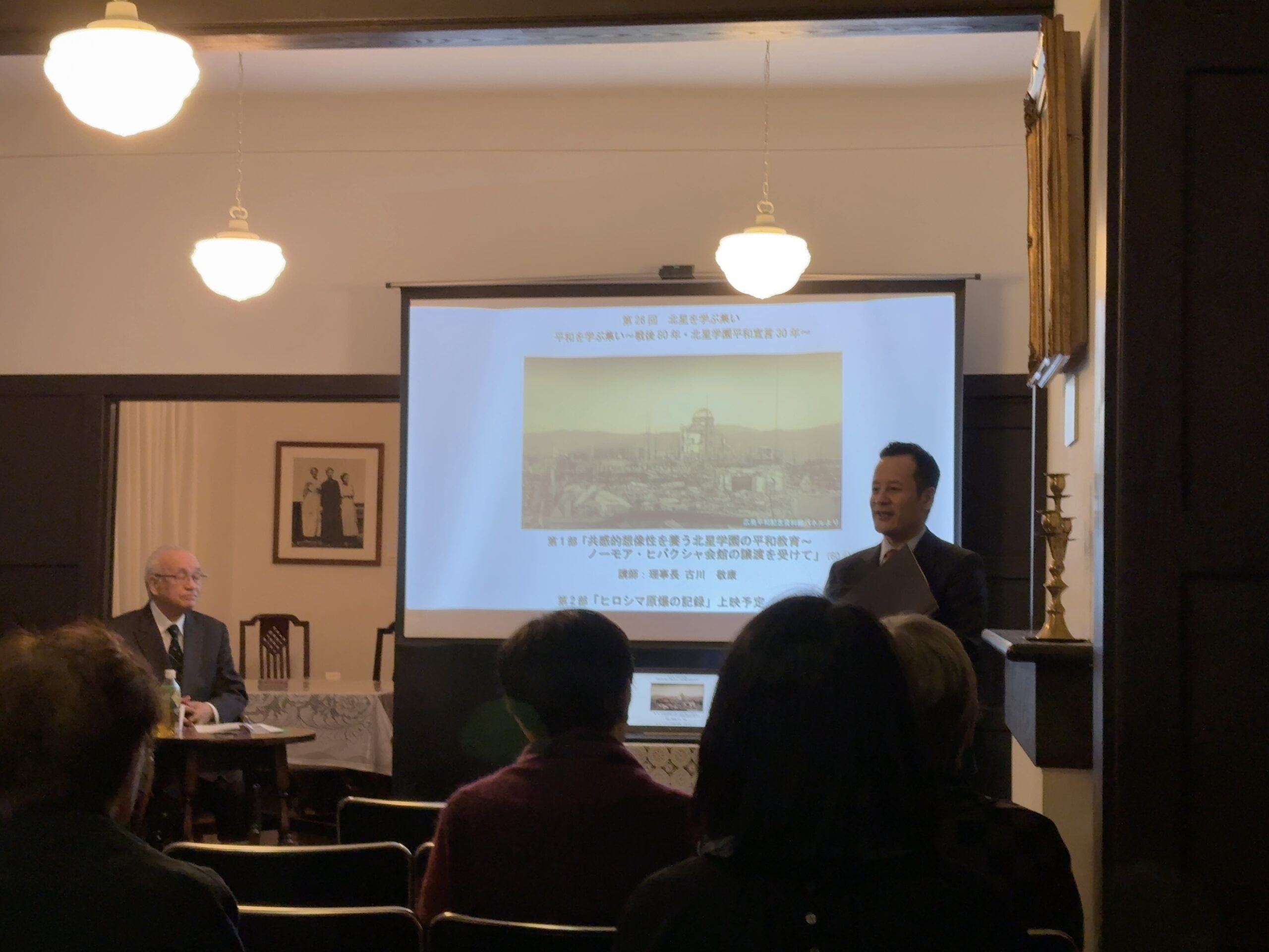 第1部は、「共感的創造性を養う北星学園の平和教育~ノーモア・ヒバクシャ会館の譲渡を受けて」と題し、古川理事長からの講演、第2部は、当時のようすを撮影したフィルムや遺品をもとに製作された、『ヒロシマ原爆の記録』(1970年)を上映しました。